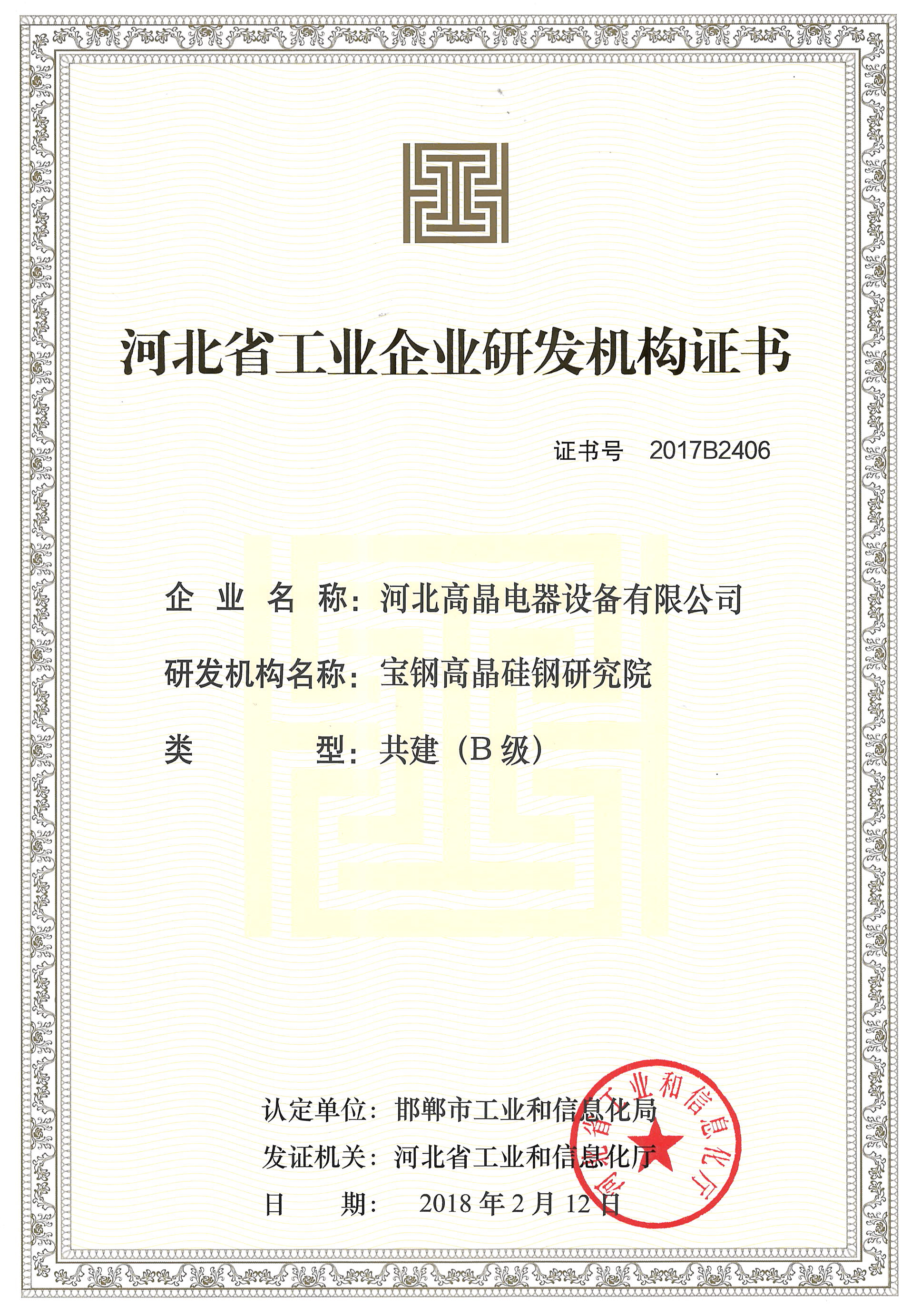 河北省工業(yè)企業(yè)研發(fā)機構(gòu)證書